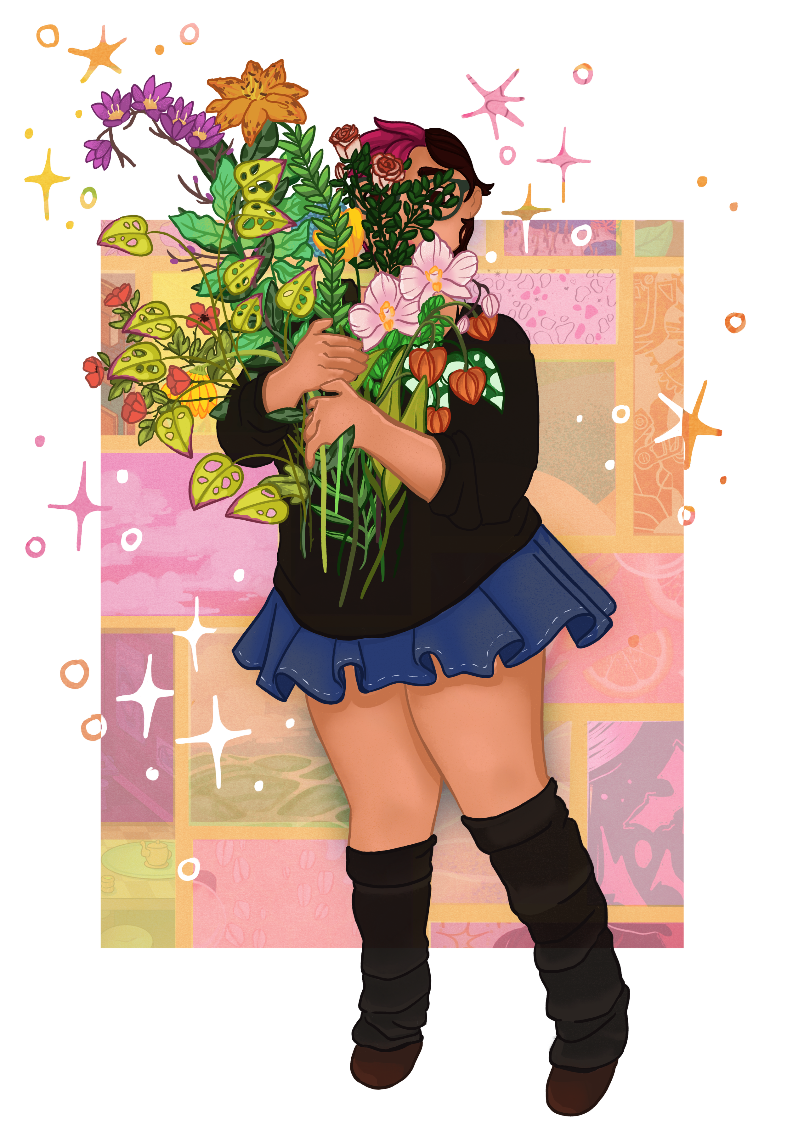 My work is characterized by bright colors, round shapes, and tons of texture, which is pretty much how my thoughts are formulated. I work primarily with Procreate and Adobe Photoshop, but I also love to play with mixed media! When I’m not making art I can be found wandering various midwestern cities on public transit, making up soap operas with pigeons.