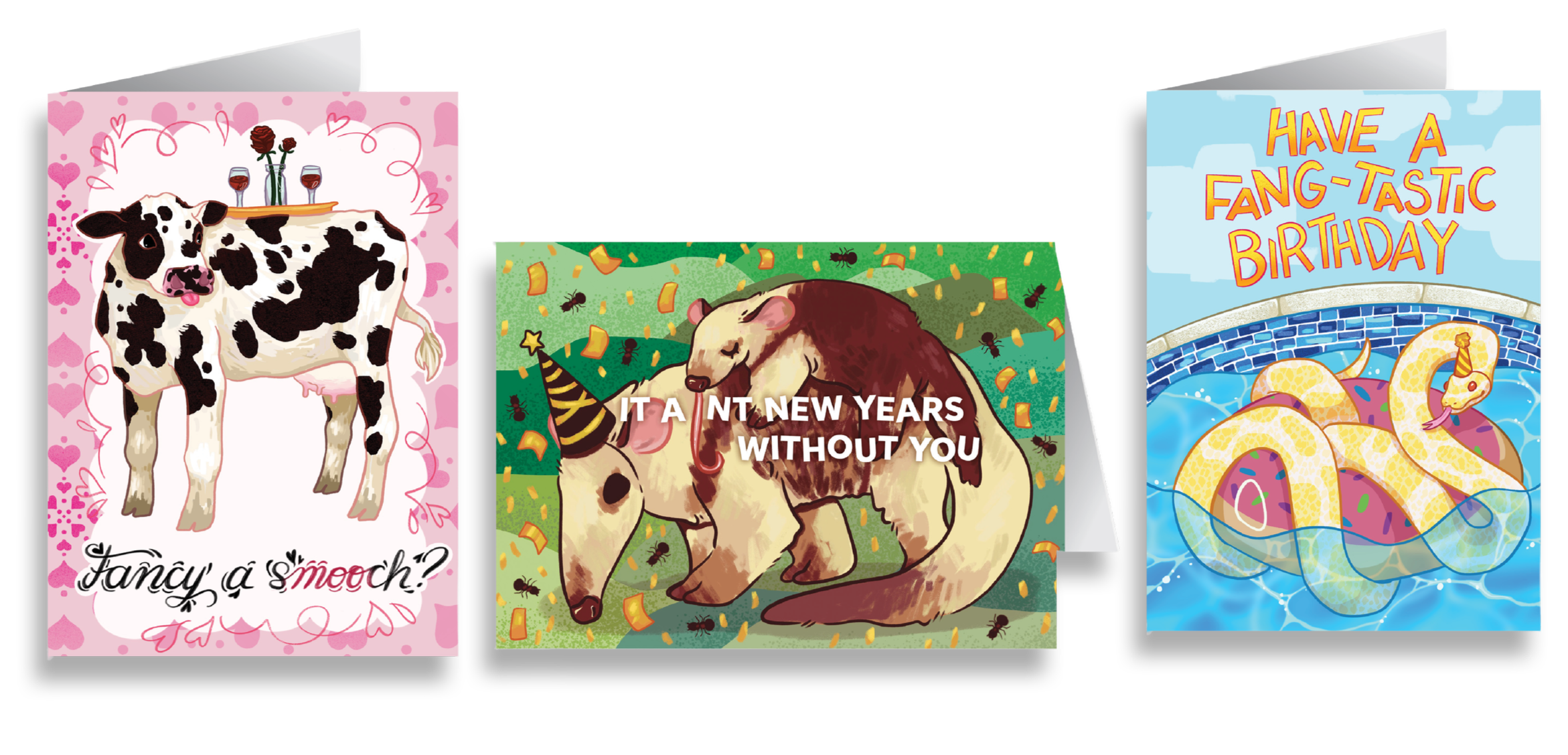 Animal themed greeting cards for various holidays.