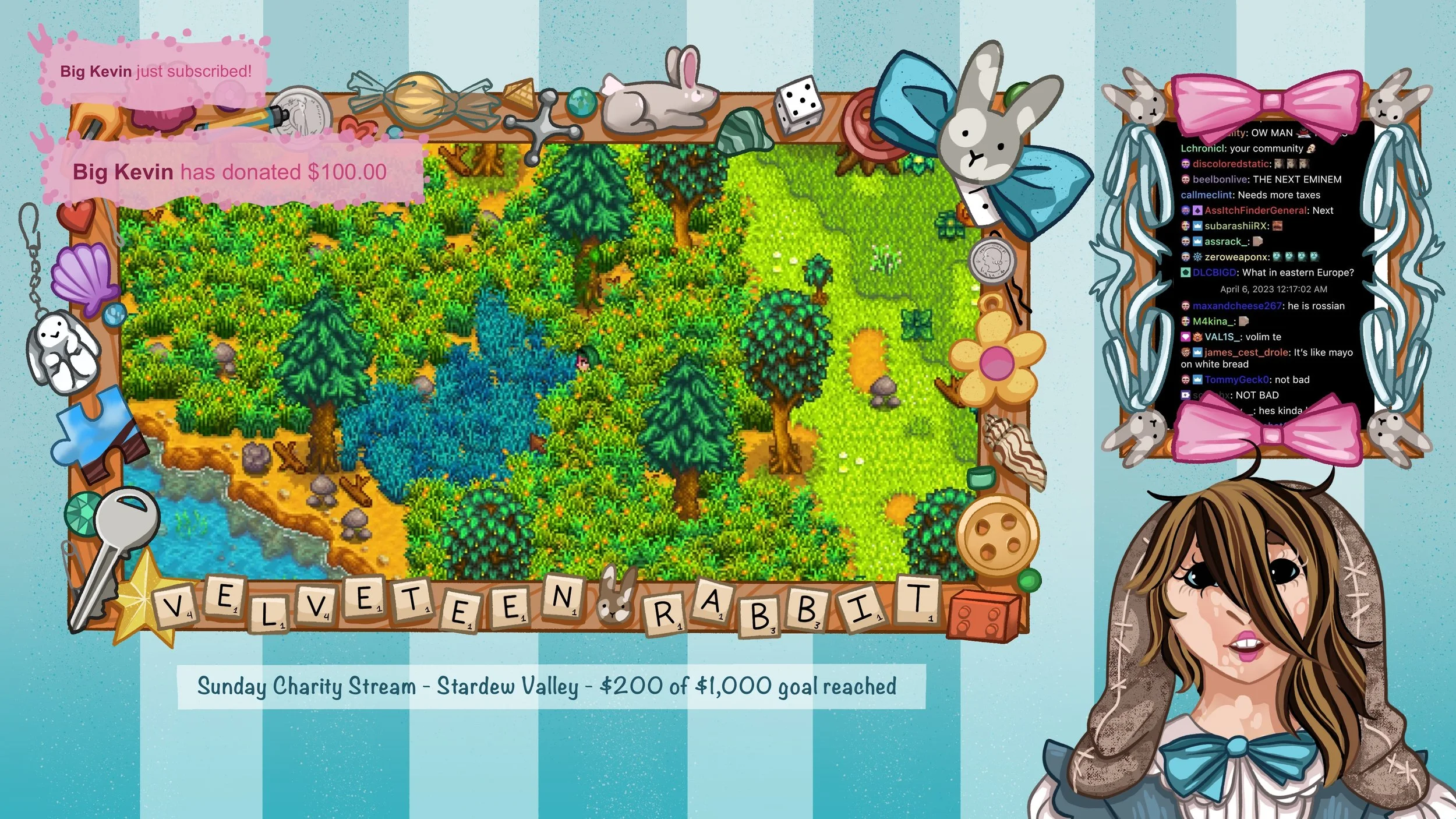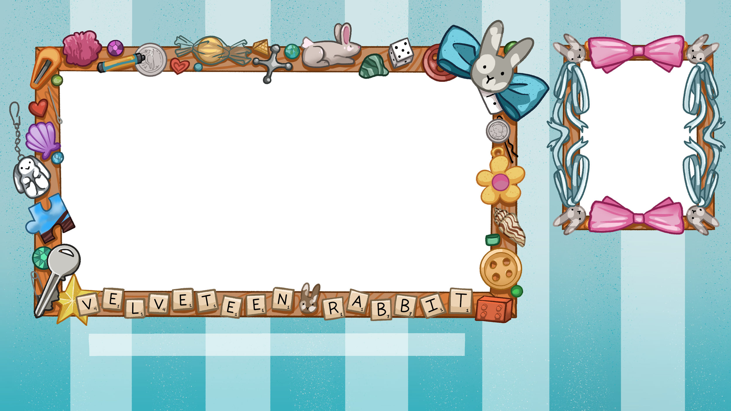Illustrated assets for streaming under a virtual persona. Full screen “starting soon” illustration, stream overlay with illustrated frames for placing game and chat windows, and custom notification popups.
